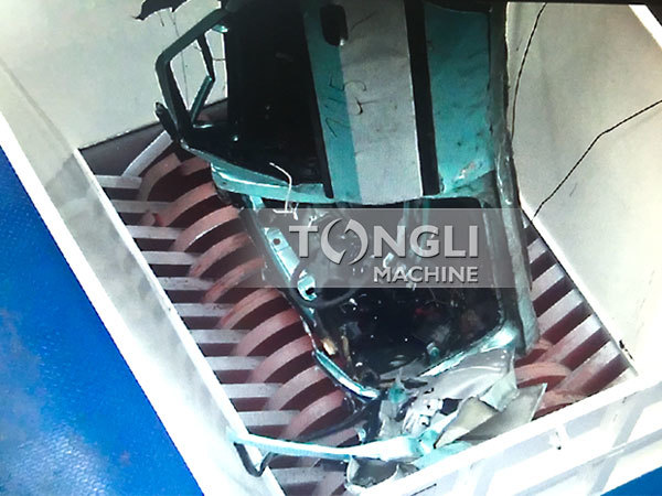 只見開始的時候撕碎機(jī)內(nèi)部的刀組開始了對向工作,空轉(zhuǎn)了幾分鐘后,便是重頭戲的開始,工人操作著一臺叉車將出租車樣式的汽車外殼投入了撕碎機(jī)倉內(nèi),物料在接觸到內(nèi)部轉(zhuǎn)動的刀組時,會被已經(jīng)運作良久的刀組撕碎,擠壓,剪切成小規(guī)格、尺寸統(tǒng)一的長條片狀,之后從底部排出,通過輸送帶輸送出去并歸堆,這是撕碎機(jī)的整個運行效果,針對本次客戶的需求,僅需這一套設(shè)備即可完成生產(chǎn)需求,因此,并沒有搭配破碎機(jī)進(jìn)行細(xì)碎效果。